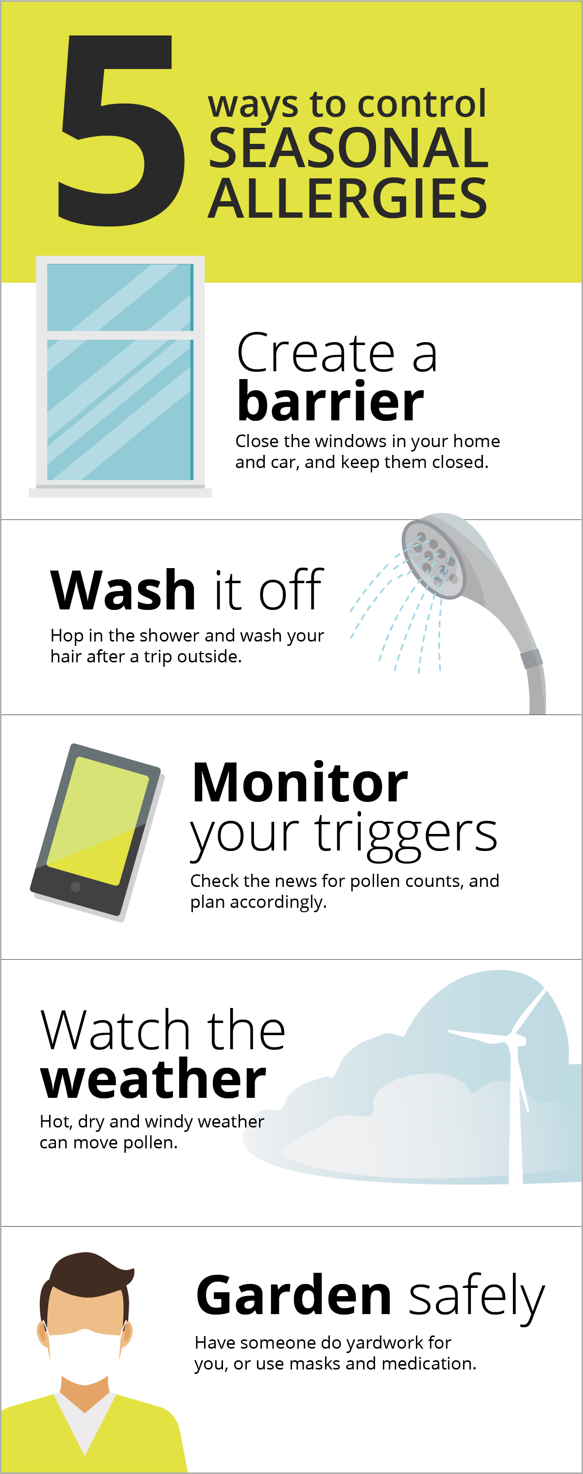 Monitor your triggers. Check the news for pollen counts, and plan accordingly.