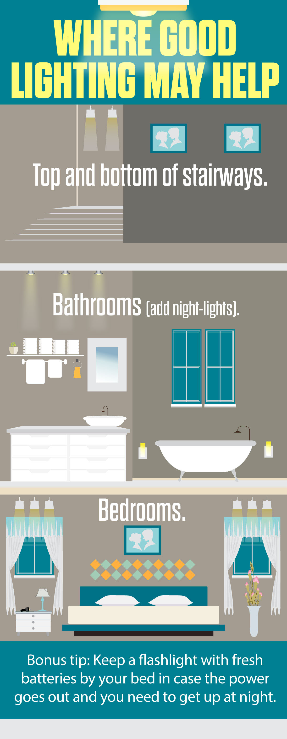 Falling is especially dangerous for older adults, who may be more likely to break a bone. Making sure your home has good lighting is one of the steps you can take to avoid a tumble.