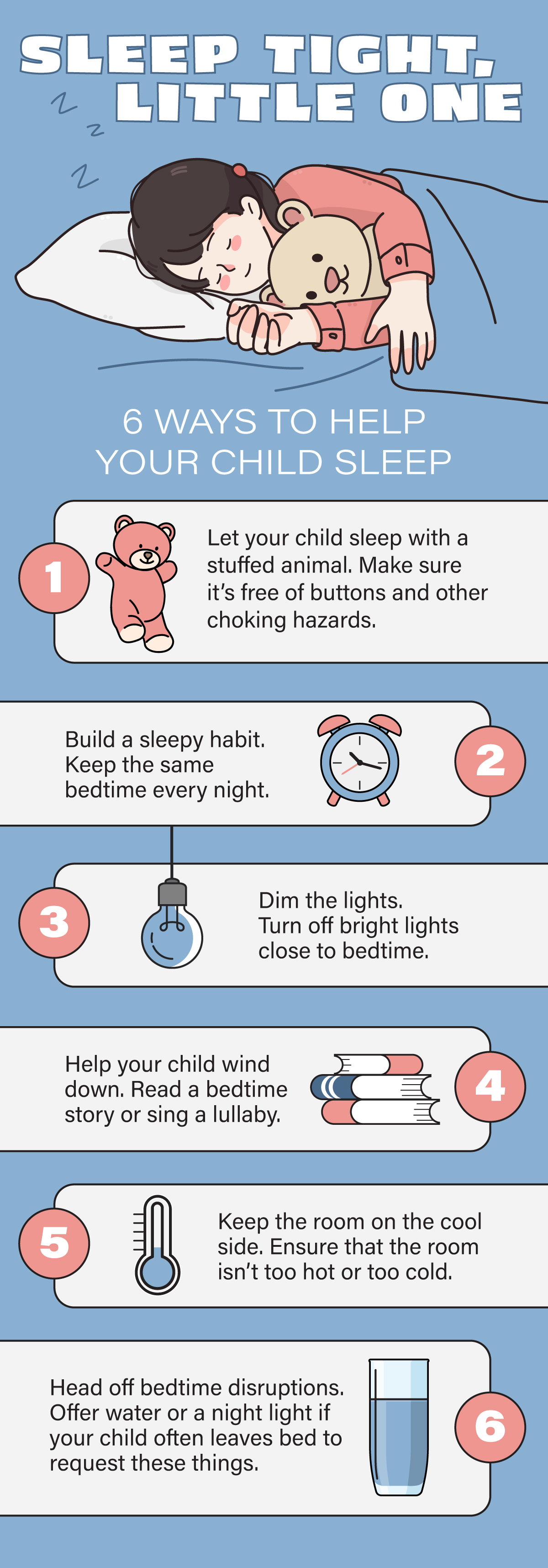 1. Let your child sleep with a stuffed animal. Make sure it's free of buttons and other choking hazards.